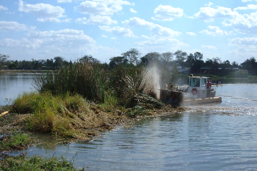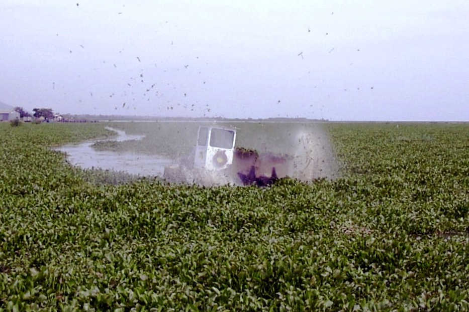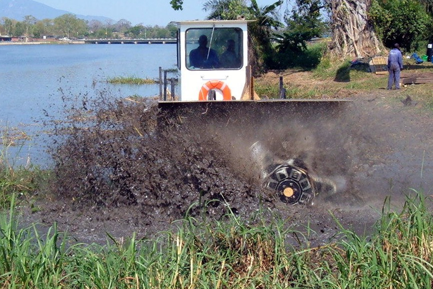To make water hyacinth removal more efficient, the Swamp Devil and Weed Harvester can work together. The Swamp Devil chops through thick mats of water hyacinth and other plants, breaking them into smaller pieces. Then, the Weed Harvester collects and removes the chopped-up plants from the water. The Weed Harvester gathers the plant material into a hopper, so it can be safely disposed of, keeping the water clear. By using both machines, large areas can be cleared quickly, making the process more effective. This method also helps protect the environment and allows people to continue activities like fishing and transportation.